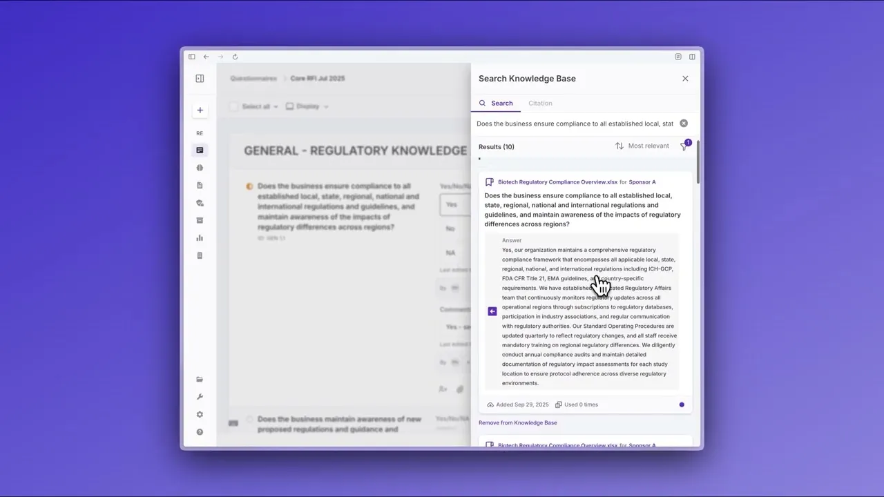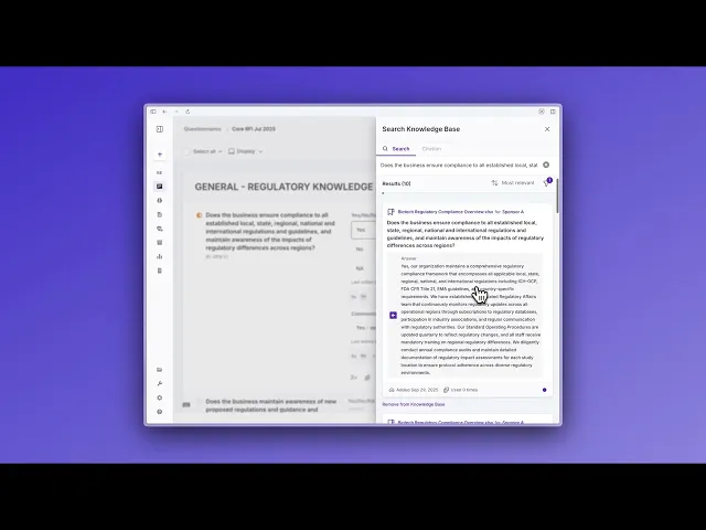 Maintain one source of truth for qualification information. Upload previous questionnaires to build your Knowledge Base, ensuring consistent, up-to-date answers across your entire team—no more conflicting responses or outdated information slipping through.